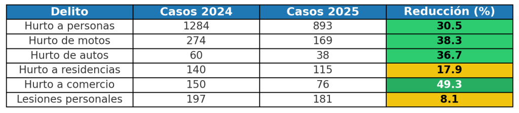 El hurto a personas, uno de los delitos que más impacta la percepción ciudadana, cayó de 1.284 a 893 denuncias, es decir, 391 casos menos y una variación del 30 %. También se reportó una reducción del 18 % en el hurto a residencias, al pasar de 140 a 115 registros, y del 8 % en lesiones personales, que bajaron de 197 a 181 casos.